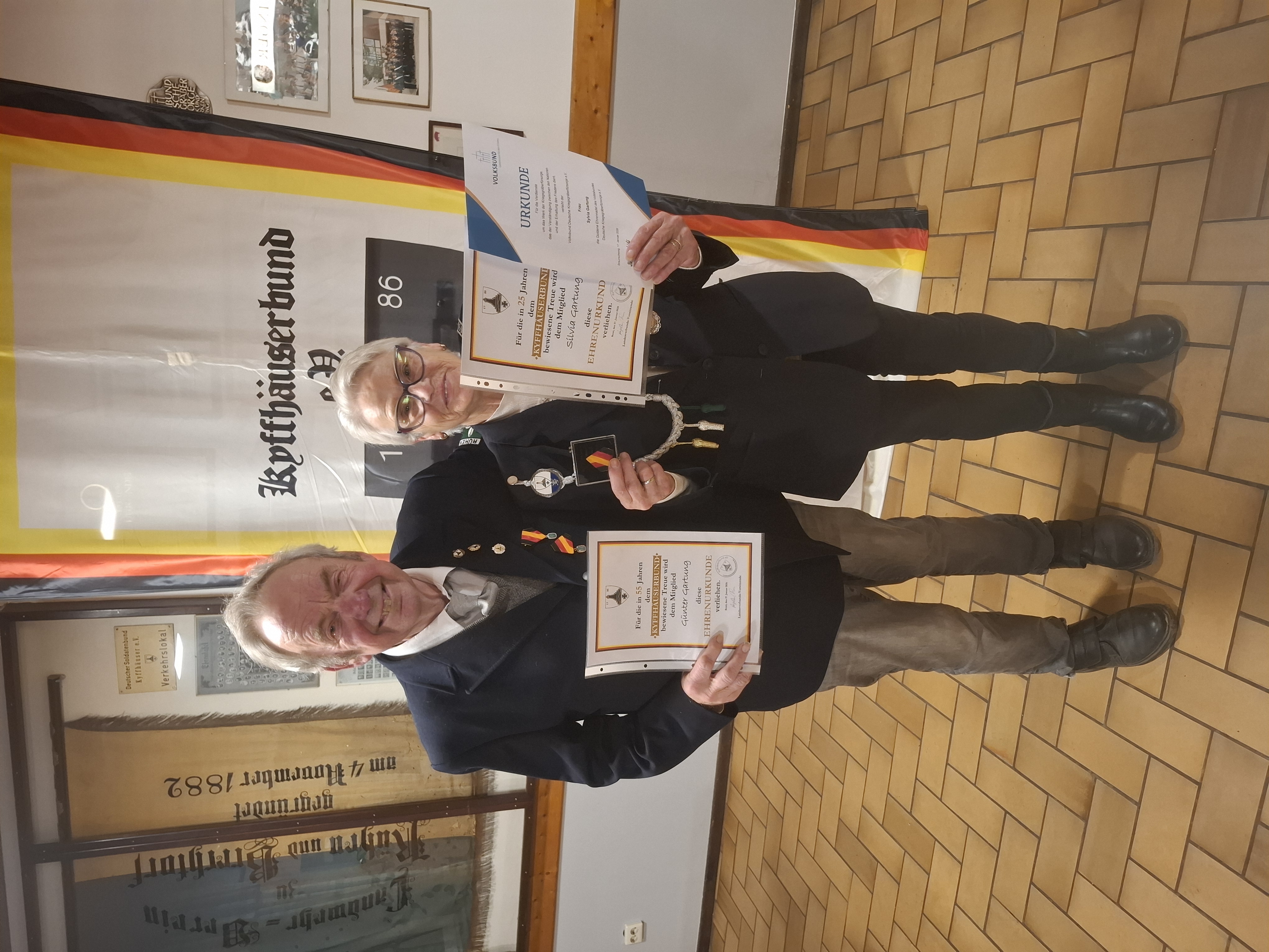 Ein weiterer Höhepunkt der Versammlung waren die Ehrungen: Zahlreiche Mitglieder wurden für ihre langjährige Treue zur Kameradschaft ausgezeichnet, ganz besondere Erwähnung fand die 55-jährige Mitgliedschaft von Günter Gartung. Silvia Gartung wurde nicht nur für ihre 25-jährige Treue zur KK Rühen geehrt, sondern erhielt eine besondere Anerkennung für das außergewöhnliche Engagement bei der Haussammlung für die Kriegsgräberfürsorge. Sie wurden dafür vom Volksbund Deustche Kriegsgräberfürsorge mit der Verdienstnadel in Gold ausgezeichnet.